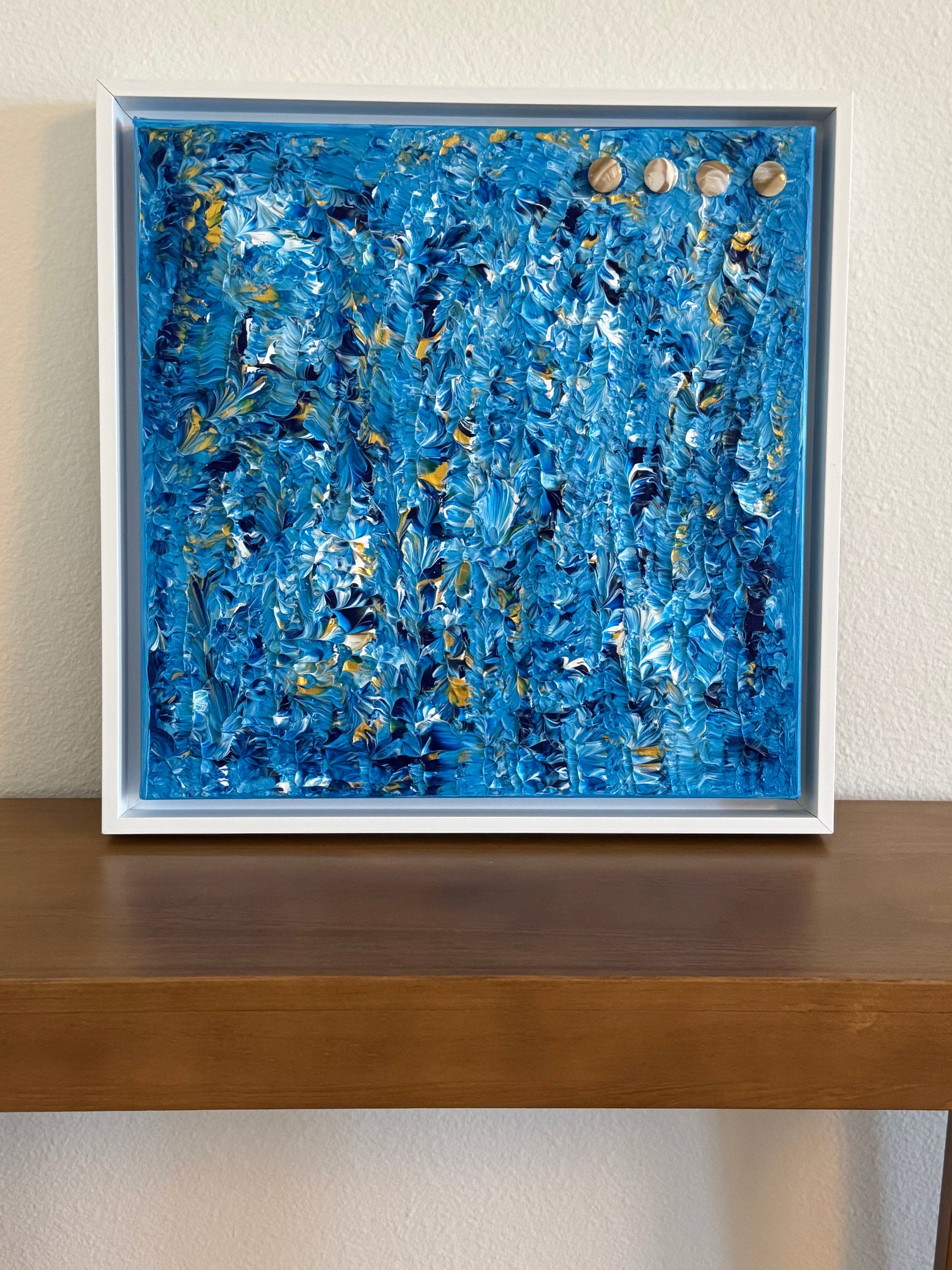 acrylic paint on canvas in a textured finish. sealed and framed in floating frame.
